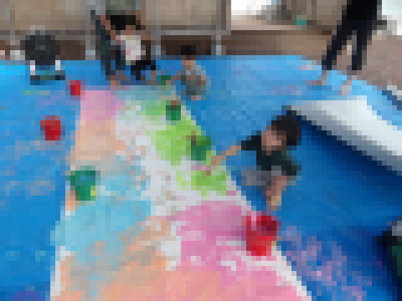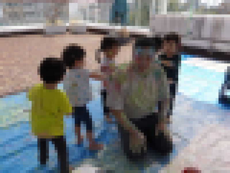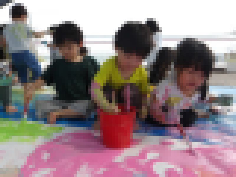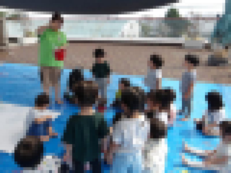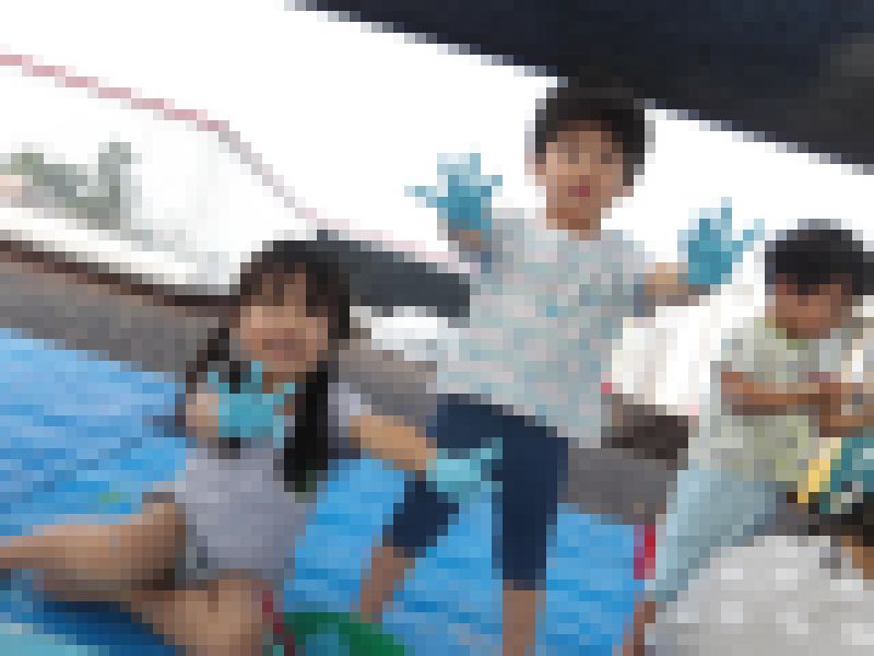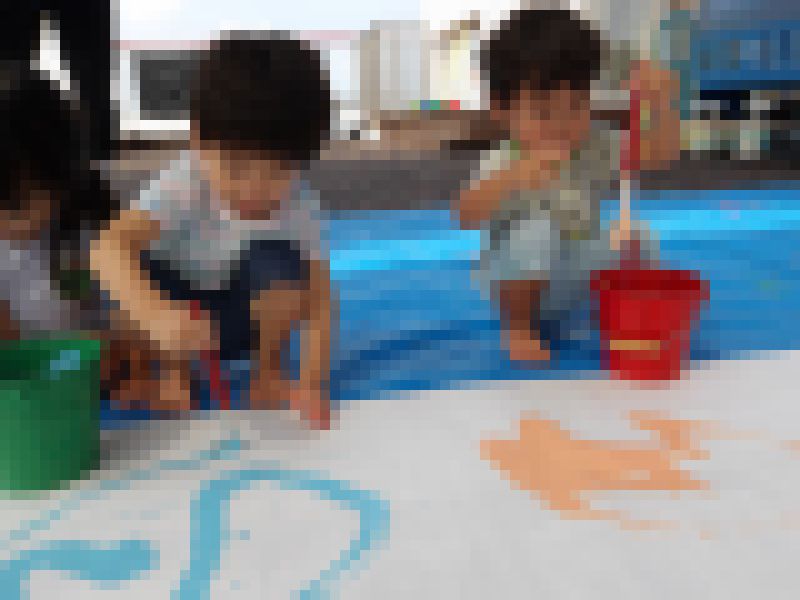 絵の具のぬたくりをしました ~2才児 先日、2才児クラスが屋上で絵の具遊びをしました。 おそるおそる絵の具に触ってみると、ひんやり・・・。 冷たくて気持ちがいい! 大きな白い紙に思い思いに色を重ねていきます。 いつの間にか自分の手や足もキャンバスに! そしてついには担任の背中や顔も絵の具まみれになってしまいました。 « 1才児クラス 自由遊びの様子 運動会のリハーサルをしました »